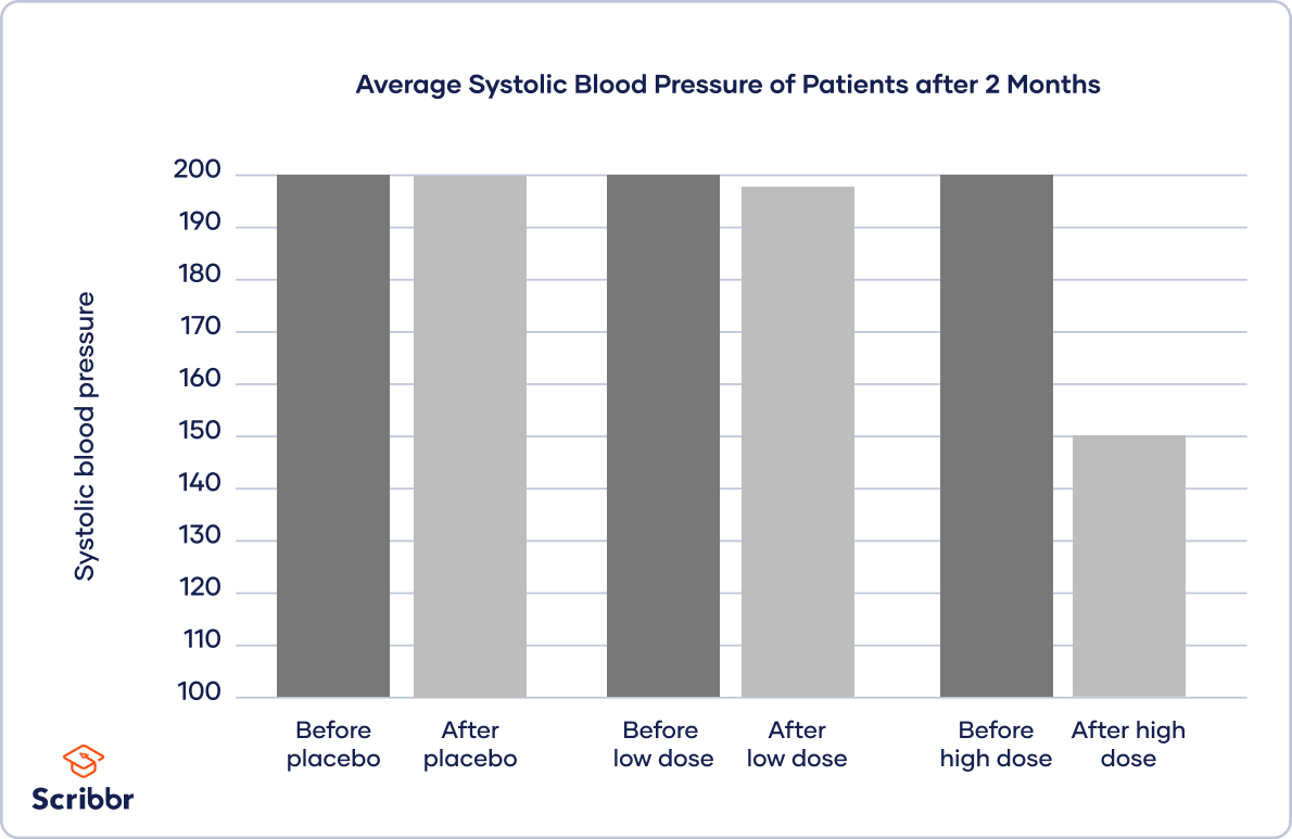 Based on your results, you note that the placebo and low-dose groups show little difference in blood pressure, while the high-dose group sees substantial improvements.